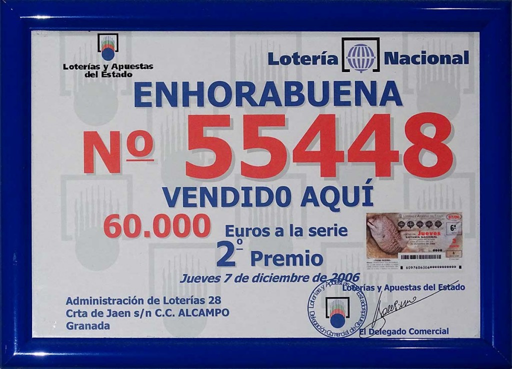 El 11 de Octubre de 2008 vendimos el segundo premio de la Lotería Nacional.07.12.20062º Premio Lotería Nacional