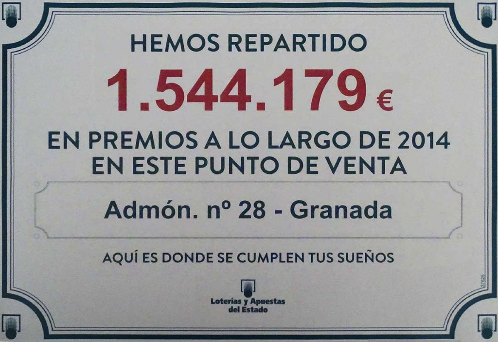 Somos la Administración de Lotería de Granada número 28. Inaugurada en el año 1998, la Administración de Loterías y Apuestas Nº 28 de Granada: EL DUENDE DE LA ALHAMBRA , ha entrado en la leyenda de la lotería con el TERCER PREMIO del Sorteo de Navidad de 1999 y con el PRIMER PREMIO del 1 de abril de 2000.