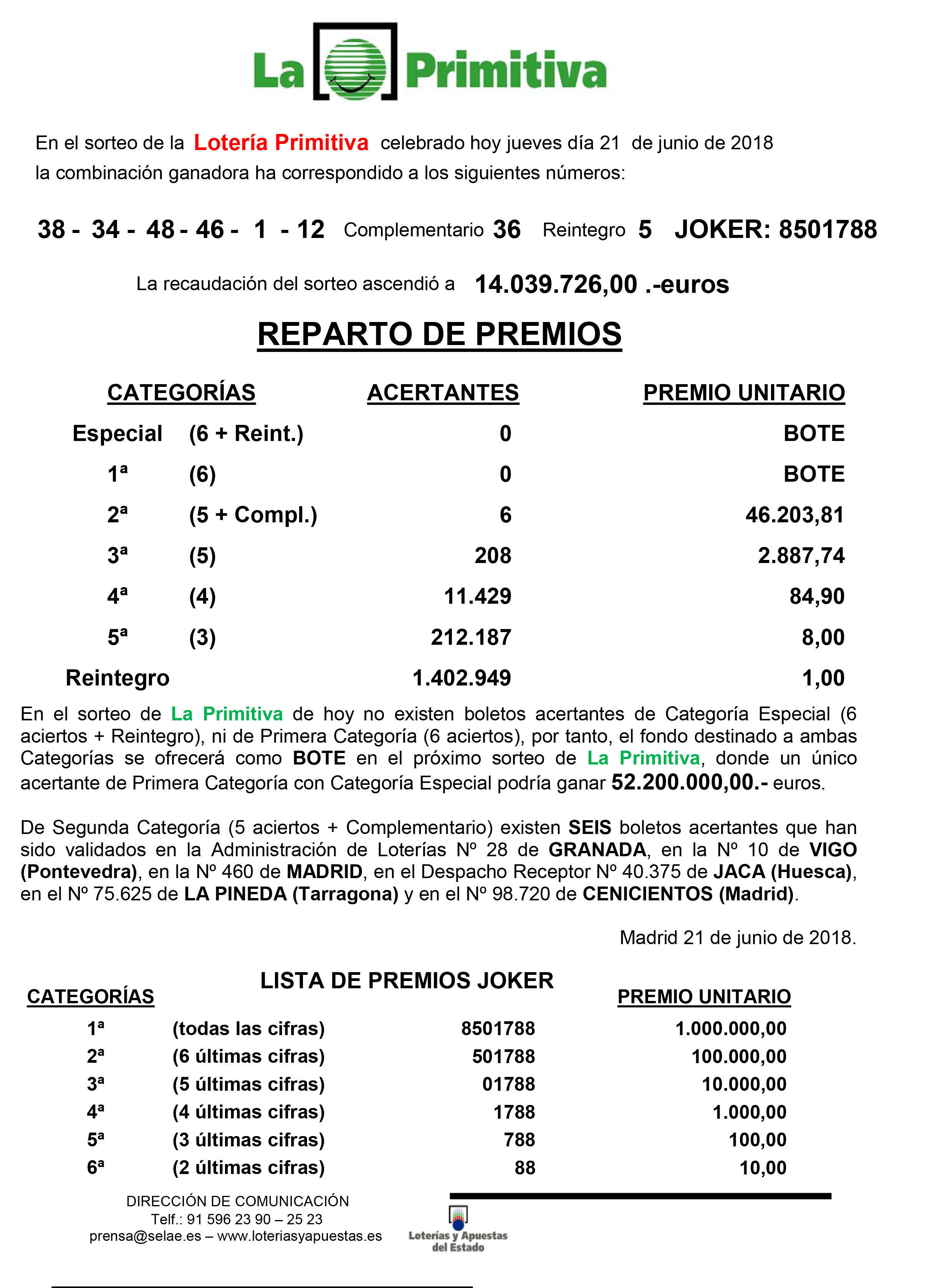 De categoría especial –seis aciertos más reintegro– y de primera categoría –seis aciertos– no han existido acertantes, por lo que un único acertante de primera categoría con categoría especial podría ganar 52.200.000 euros en el próximo sorteo de la Primitiva.